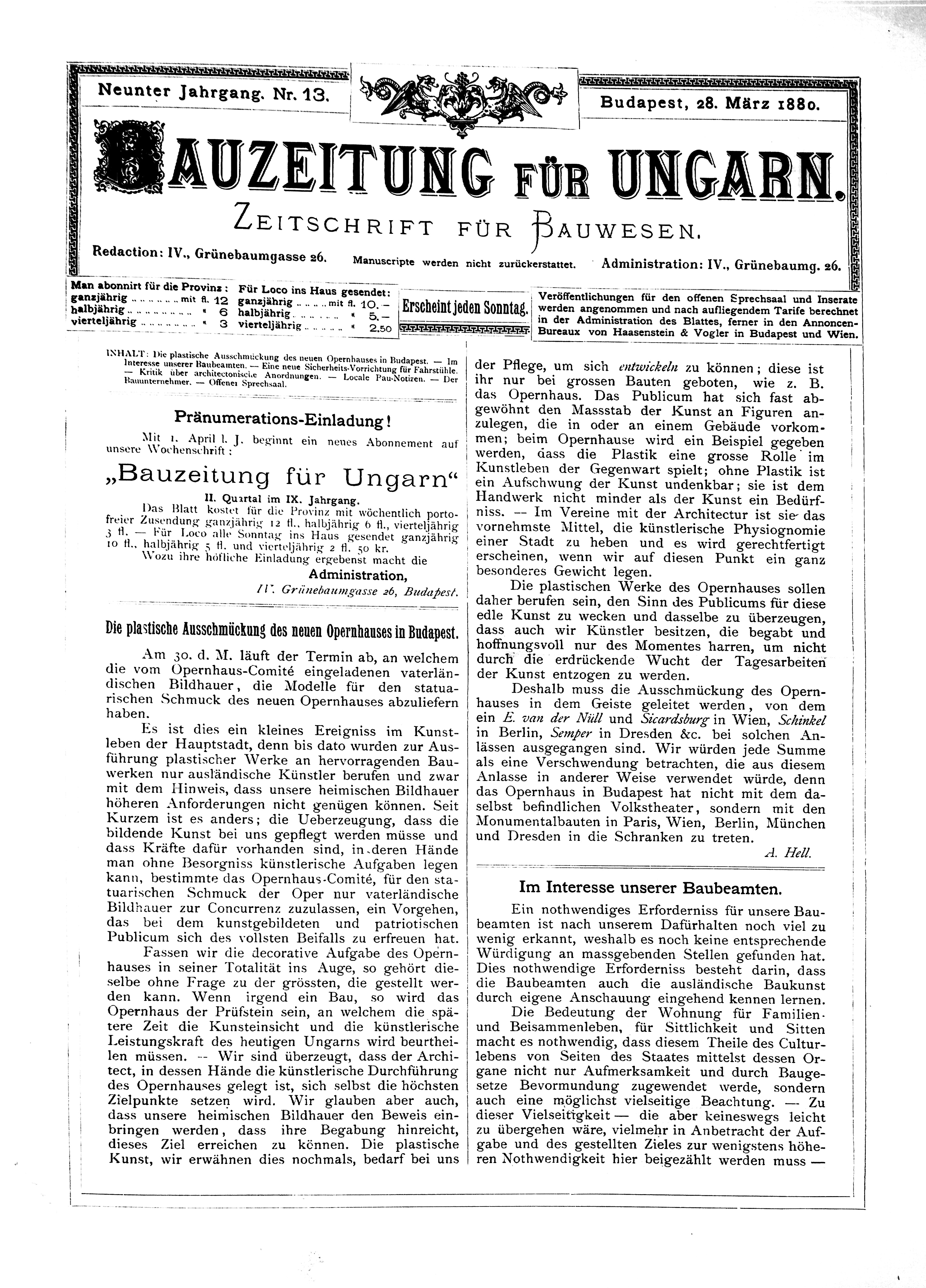 Magyar királyi Operaház PreviousNext Toggle image A. Hell: Die plastische Ausschmückung des neuen Opernhauses in Budapest Dokumentum típusa Egykorú ismertetések Kiadvány címe Bauzeitung für Ungarn Keletkezés ideje 1880.03.28 IX. évf. 13. szám. p. 109. Őrzési hely Országos Széchényi Könyvtár Vonatkozó alkotás Magyar királyi Operaház Jelzet OSZK FM3/4771 Letöltés PreviousNext